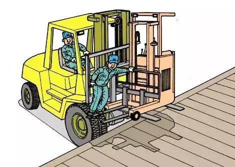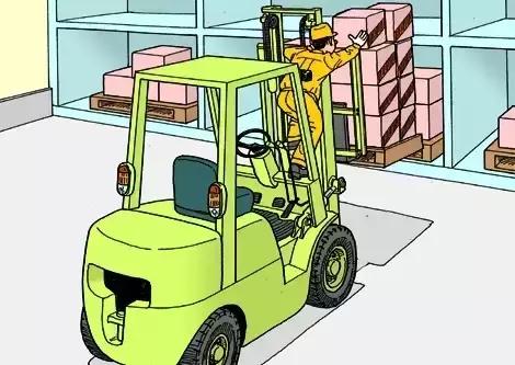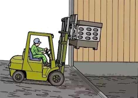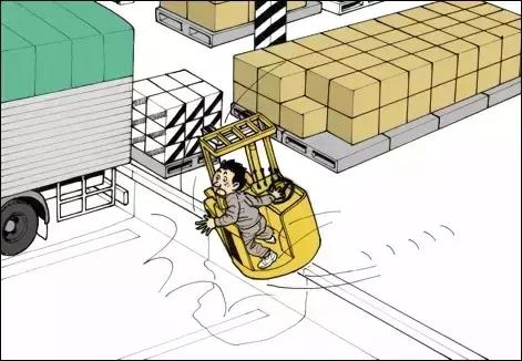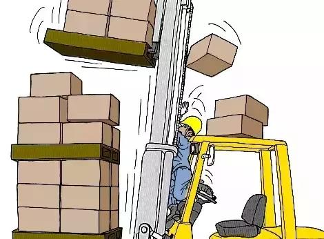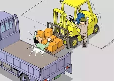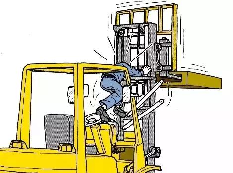 2、一名叉车司机试图站在发动中的叉车上将托盘上倾斜的货物扶正。叉车司机不小心踩到了后倾手柄,叉车货叉后倾,将司机夹在货叉桅杆与驾驶室之间。