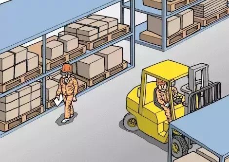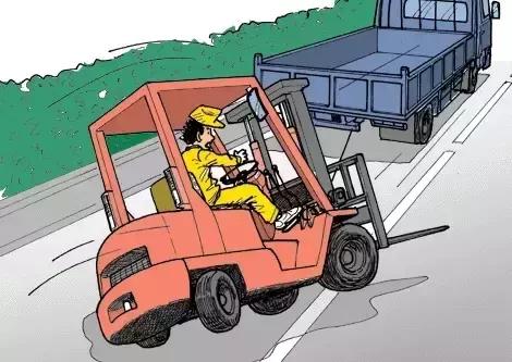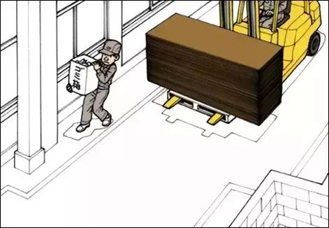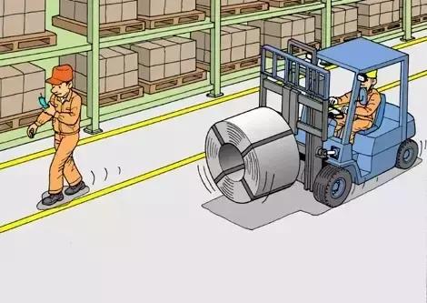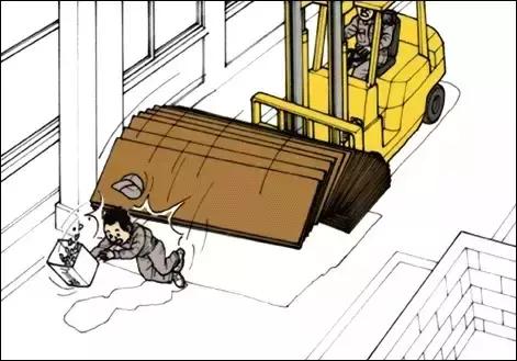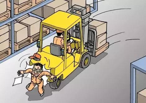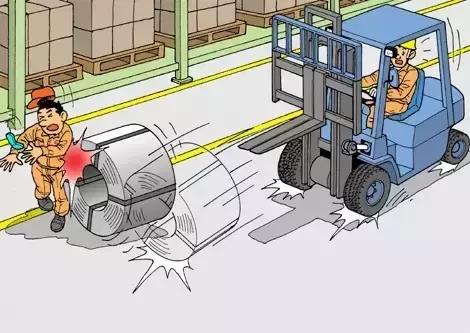 9、工人突然从行人通道走向机动车道,叉车司机急刹车,卷材滑出,将人压伤。