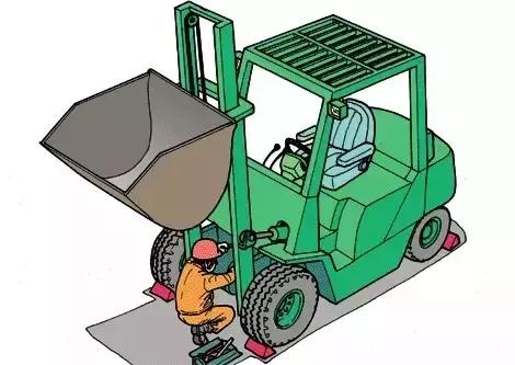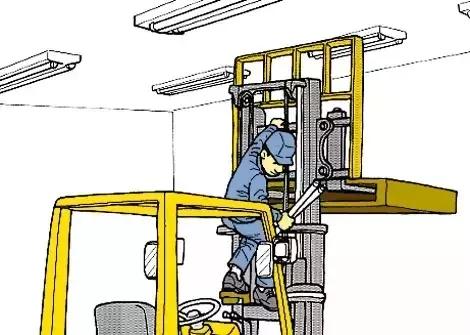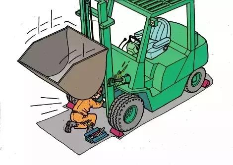 30、利用叉车当作梯子更换灯管,在下来的时候脚踩到了上升手柄,将其夹(断)死。