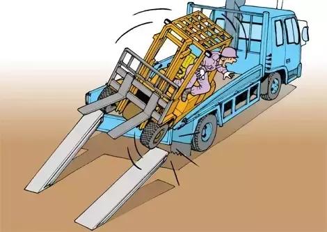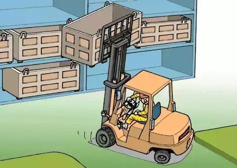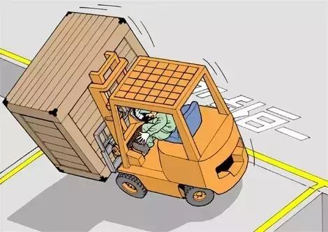 12、叉车在装货后,倒向离开时,由于过早专项,导致货叉未离开货物,发生侧翻。