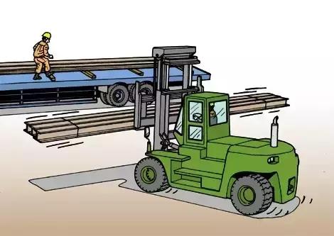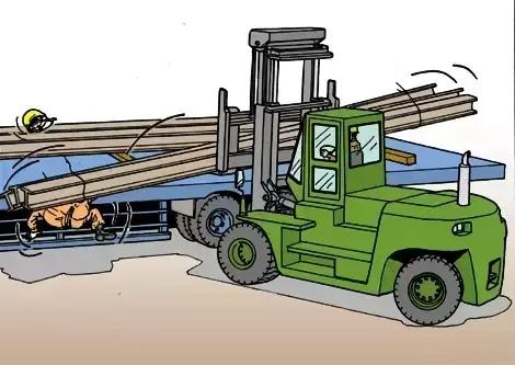 6、一名工人站在车厢上指挥叉车往车上装12m长H型钢。H型钢突然从货叉上滑落,将车上的指挥人员压在下面。