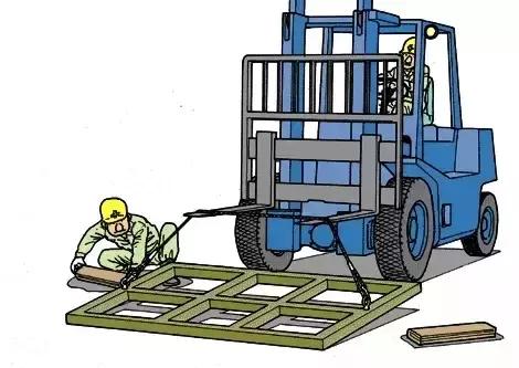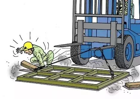17、一名员工在铁架下方放木板时,钢丝绳突然从一货叉上脱离,将其压伤。