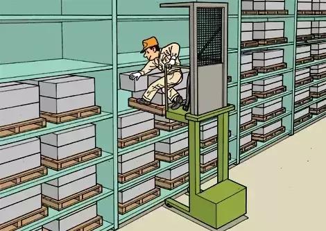 4、一名工人在仓库里用电动捡料车进行理货,他离开座位试图用手将托盘上的货物摆正,掉了下来。